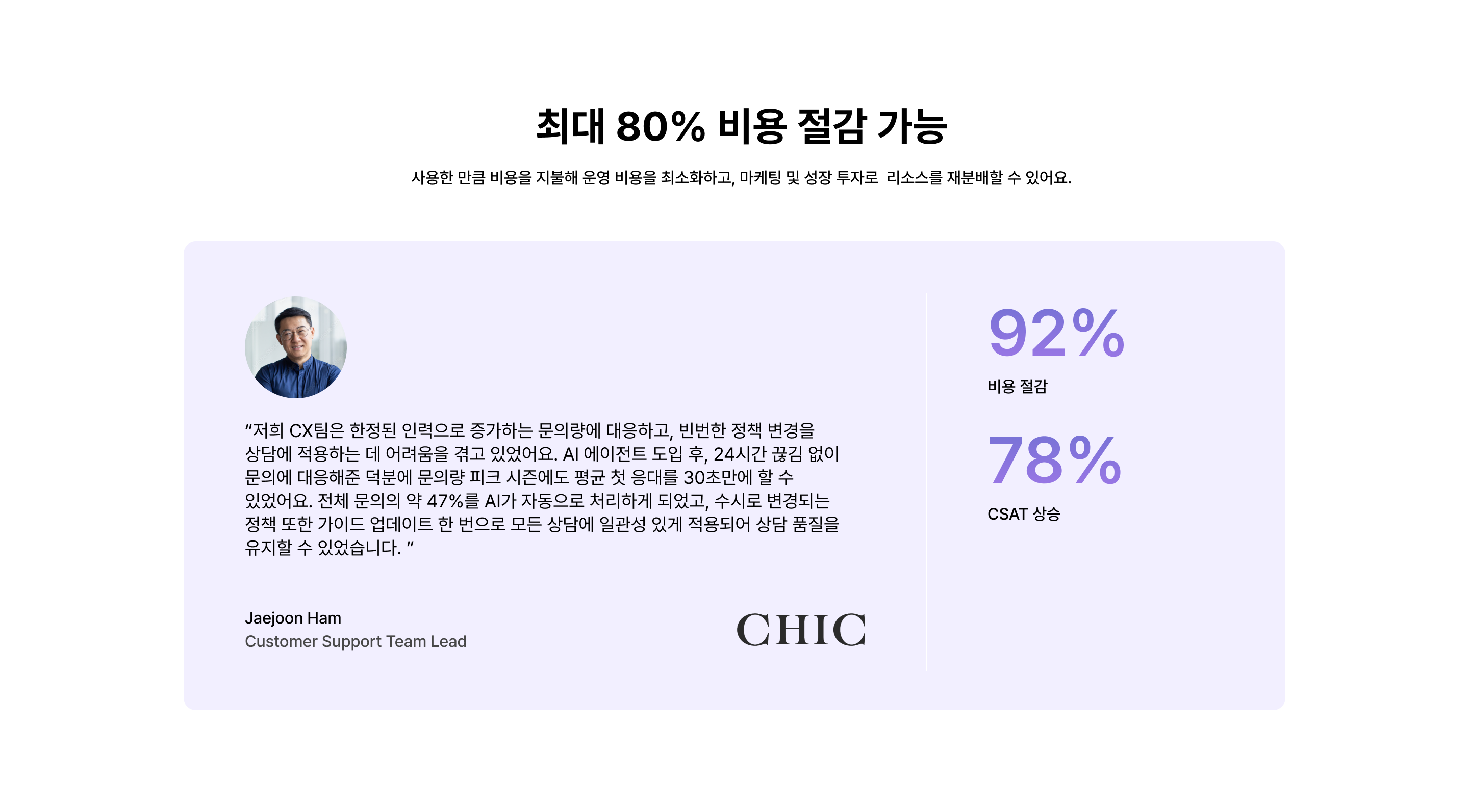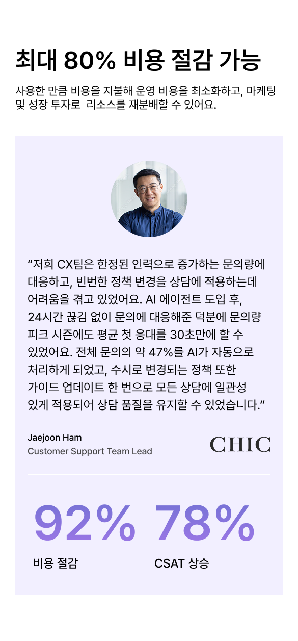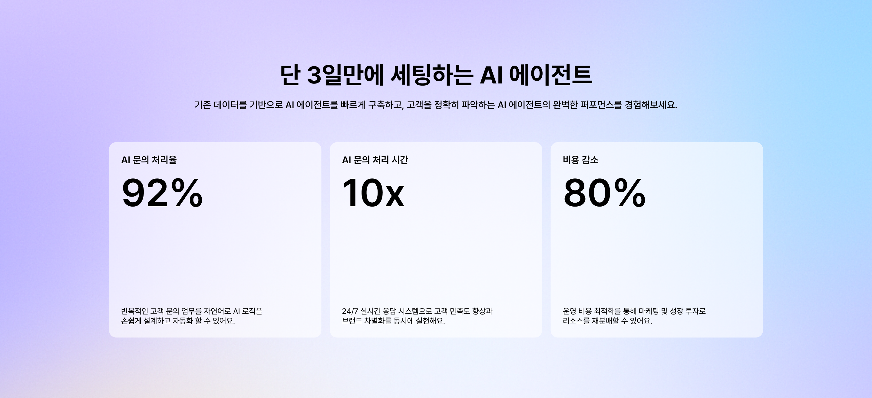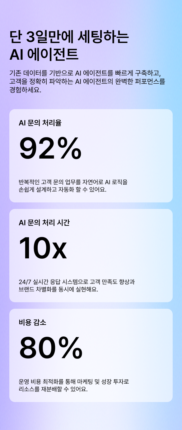 24시간 완벽한 고객 서비스를 구현하세요.AI 에이전트가 고객의 모든 순간을 케어합니다.