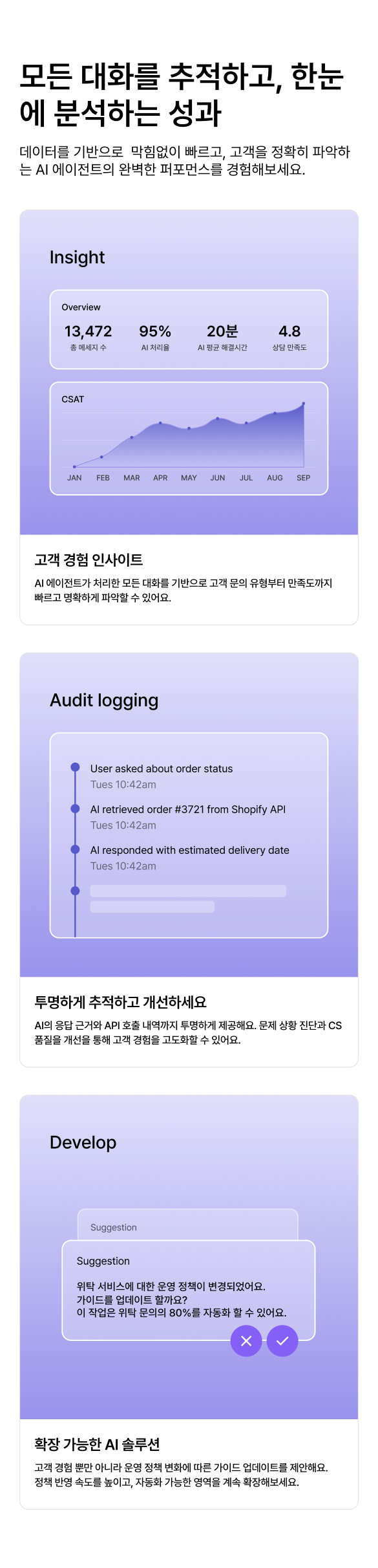 AI의 응답 근거와 API 호출 내역까지 투명하게 제공해요. 문제 상황 진단과 CS 품질을 개선을 통해 고객 경험을 고도화할 수 있어요.