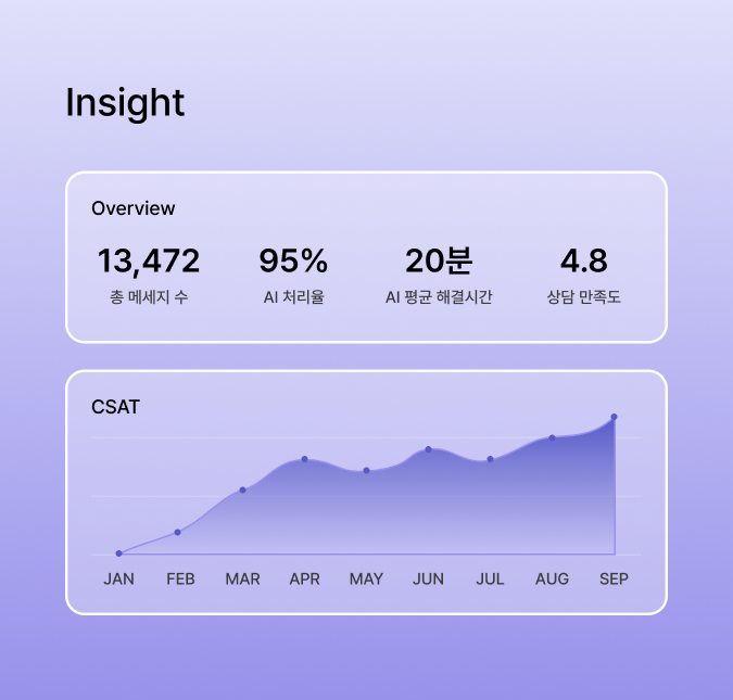 AI 에이전트가 처리한 모든 대화를 기반으로 고객 문의 유형부터 만족도까지 빠르고 명확하게 파악할 수 있어요.